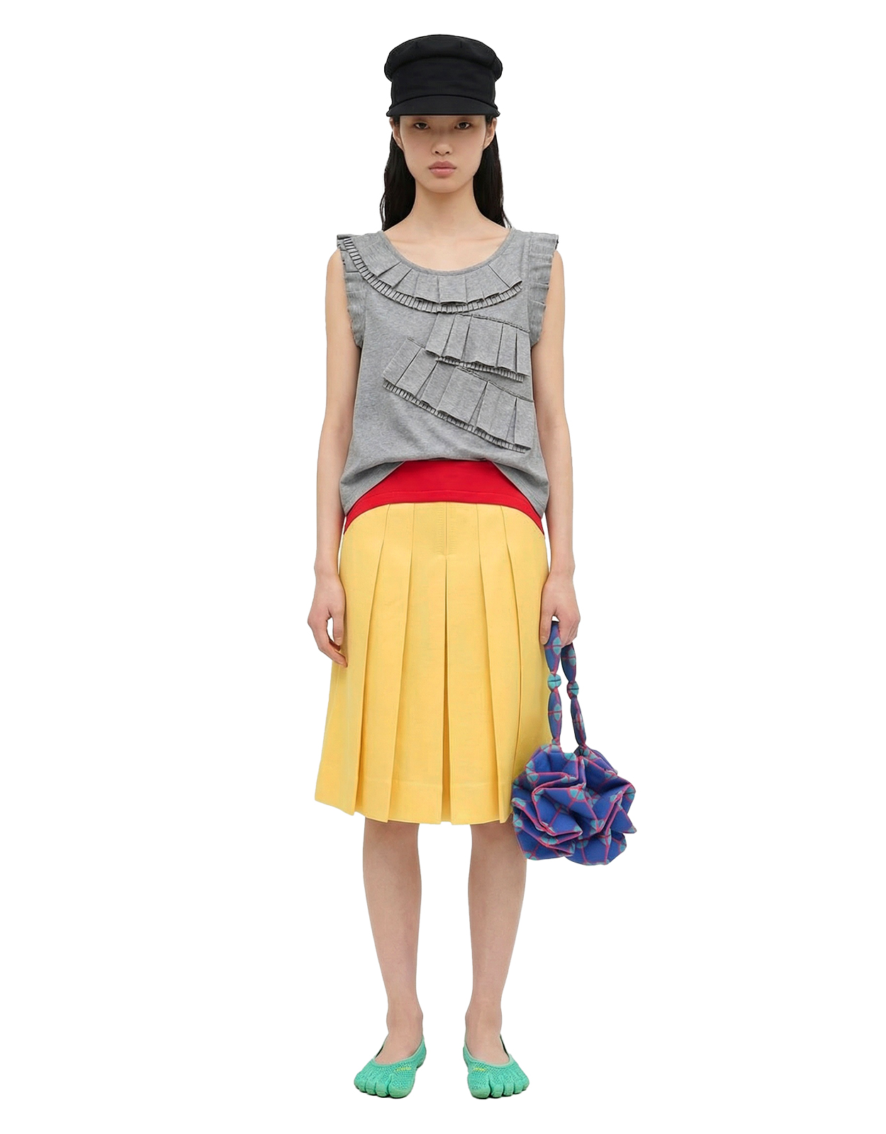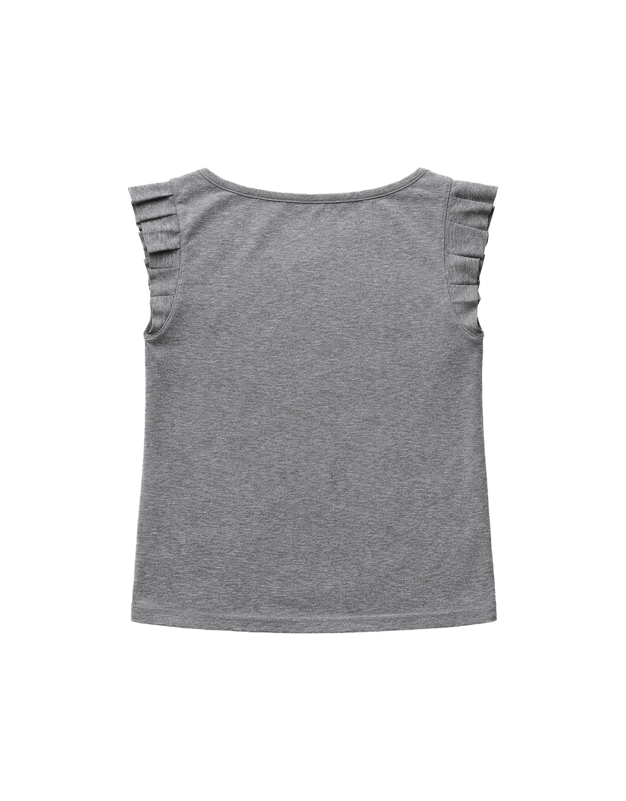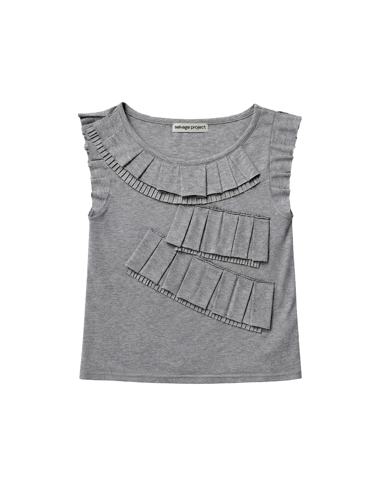 동일 원단을 별도로 재단한 뒤 팬 형태의 플리츠 디테일을 만들어 전면에 결합한 코튼 슬리브리스 탑 입니다.